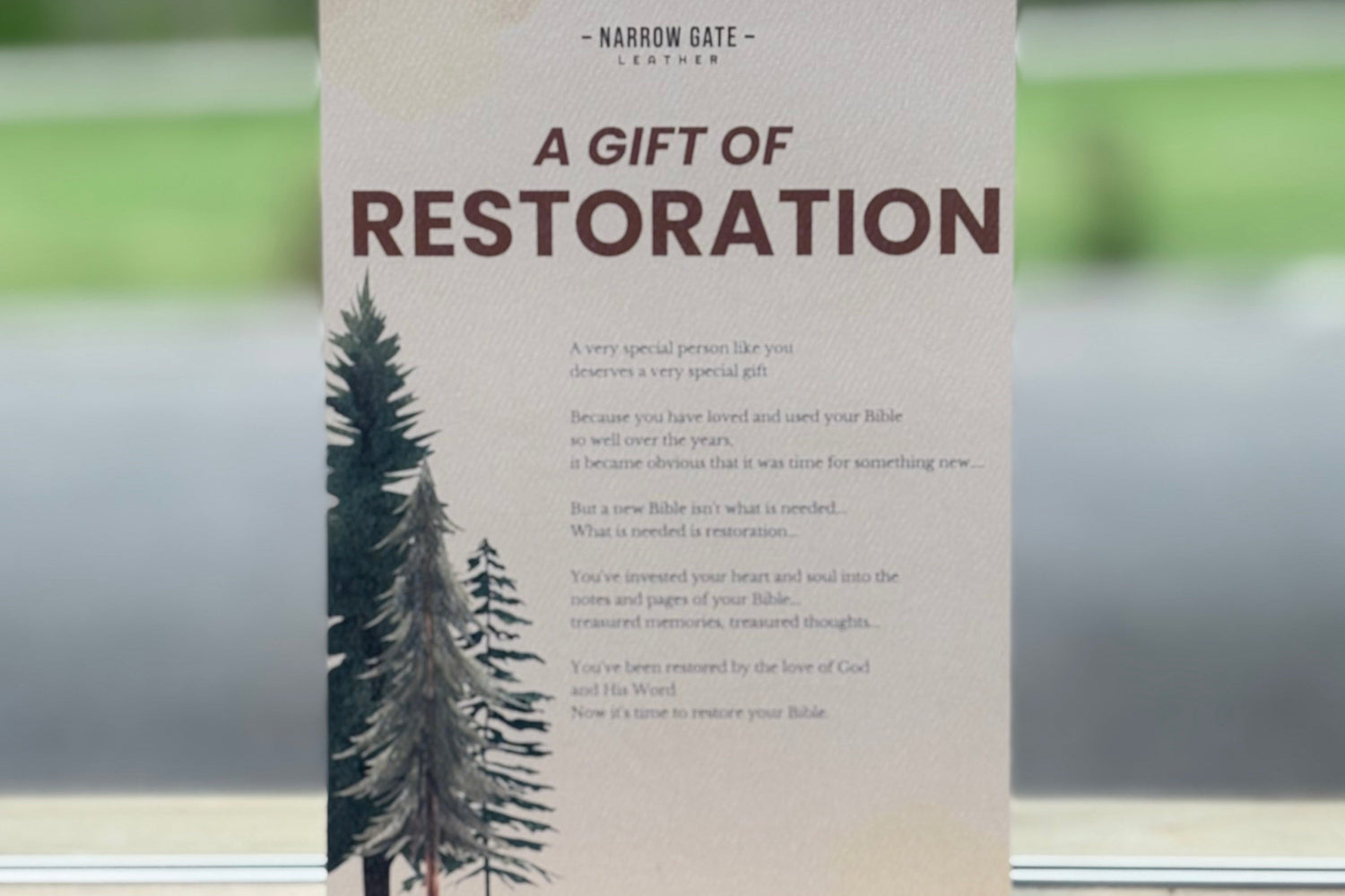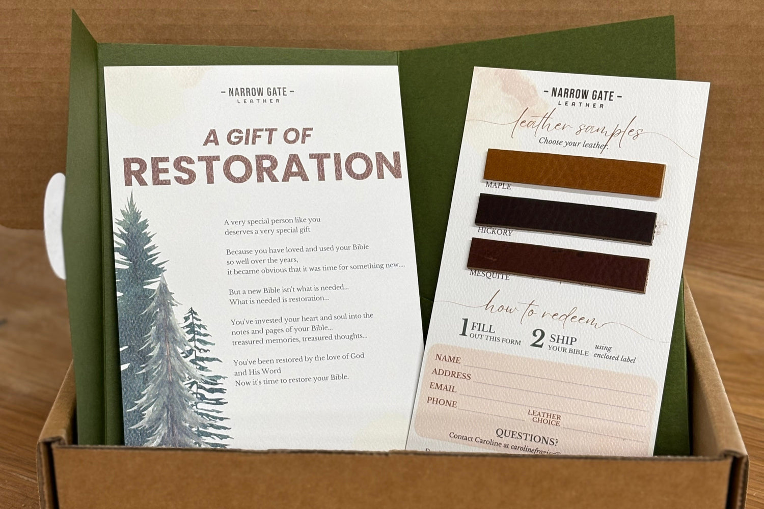You - or your loved one - receives our beautiful printed Christmas card detailing the Gift of Restoration and how to select your favorite leather color and send in the Bible to begin the restoration process.