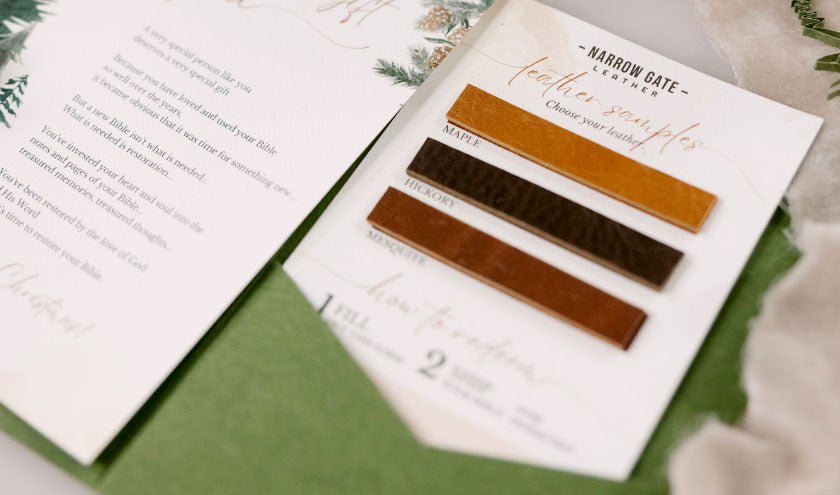 More than just a gift card, we’ve crafted this beautiful, custom Gift Card and packaging that will impress anyone who receives it. The Card explains the treasured gift you are giving and includes actual leather samples so they can select just the right cover for their bible restoration project.
